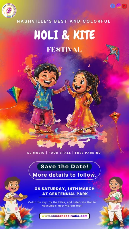 Nashville’s Most Colorful Celebration – Holi & Kite Festival 2026 🎨🪁 Get ready, Nashville! 🌈 Celebrate the festival of colors and joy at the Holi & Kite Festival — a fun-filled day for families, kids, and friends. ✨ Color the sky with kites 🎶 Enjoy DJ music 🍴 Delicious food stalls 🚗 FREE parking 📍 Location: Centennial Park, Nashville 📅 Date: Saturday, 14th March Come dressed in white, bring your energy, and let’s make memories full of colors, laughter, and culture! 💃🕺 👉 More details coming soon! 📞 Contact Information 📧 Email: info@shuddhdesiradio.com #HoliFestival #Holi2026 #HoliAndKiteFestival #NashvilleEvents #NashvilleHoli #IndianFestivalUSA #DesiEvents #FamilyFun #FestivalOfColors #KiteFestival #ShuddhDesiRadio #CommunityEvent #CelebrateColors #IndianCulture #DesiVibes See less