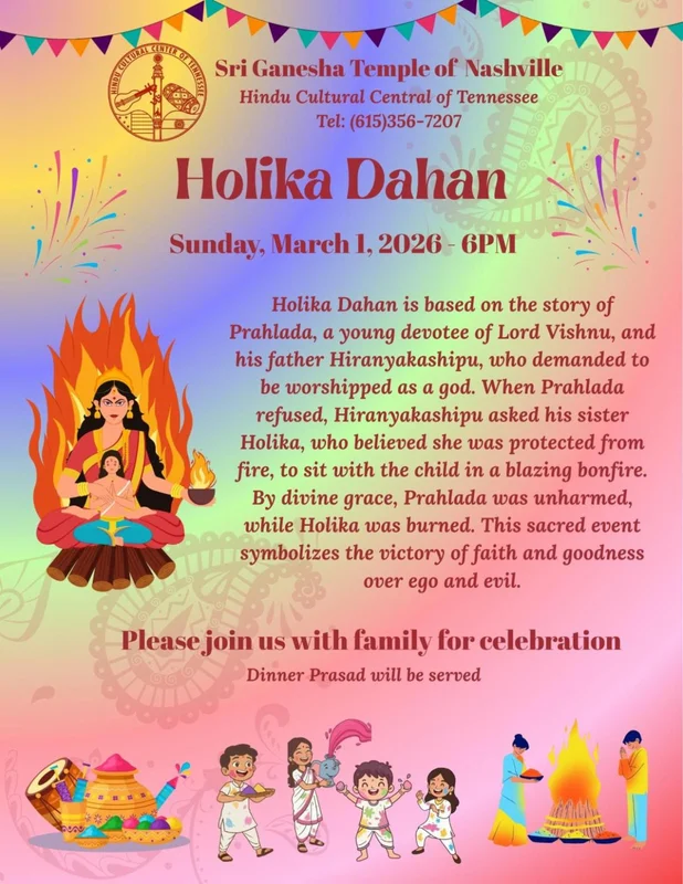 Holika Dahan is based on the story of Prahlada, a young devotee of Lord Vishnu, and his father Hiranyakashipu, who demanded to be worshipped as a god. When Prahlada refused, Hiranyakashipu asked his sister Holika, who believed she was protected from fire, to sit with the child in a blazing bonfire. By divine grace, Prahlada was unharmed, while Holika was burned. This sacred event symbolizes the victory of faith and goodness over ego and evil. Please join us with family for celebration Dinner Prasad will be served